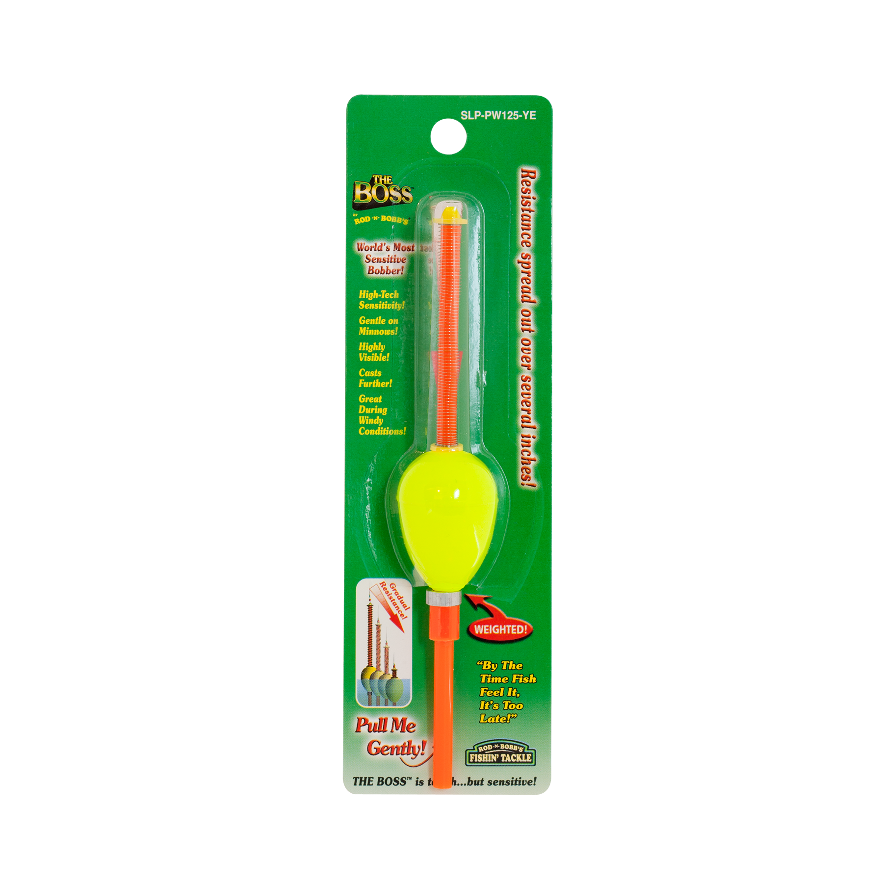 The BOSS weighted slip bobber has high-tech sensitivity! It is gentle on minnows, is highly visible with its fluorescent orange and yellow body, casts further, and is great during windy conditions. The BOSS is tough...but sensitive!